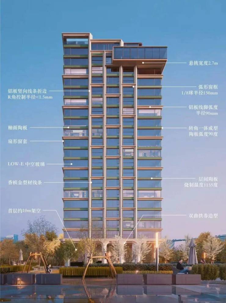 穿过归家大堂,最好看的界面来了,建筑立面的恢弘气势令人心生敬畏。会所架空层巧妙融入海派拱券设计,彰显家族的深厚底蕴与不凡气度。青绿釉陶板与仿石铝板、大面积玻璃的匠心组合,实现了东方神韵与全球视野的完美交融。弧形窗角与扇形窗套的精湛工艺一览无余,辅以精致的香槟金型材线条勾勒,赋予建筑独特的收藏价值与艺术魅力。
