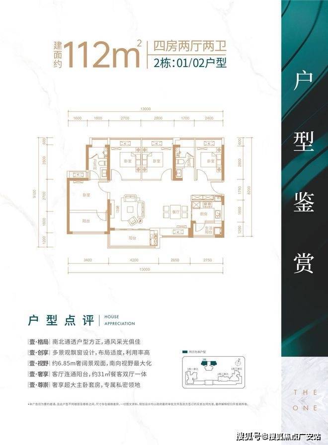 112㎡4房2厅2卫(单价7.1-7.6万总价790-850万)客厅横厅朝南带阳台,1房朝南3房朝北该户型分布在2栋01,02房