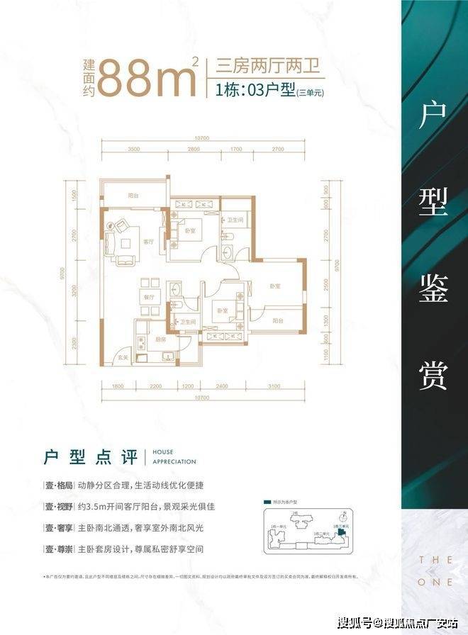 88㎡3房2厅2卫(单价7-7.6万610-660万)客厅朝北带阳台,1房朝北,2房朝南该户型分布在1栋三单元03号房