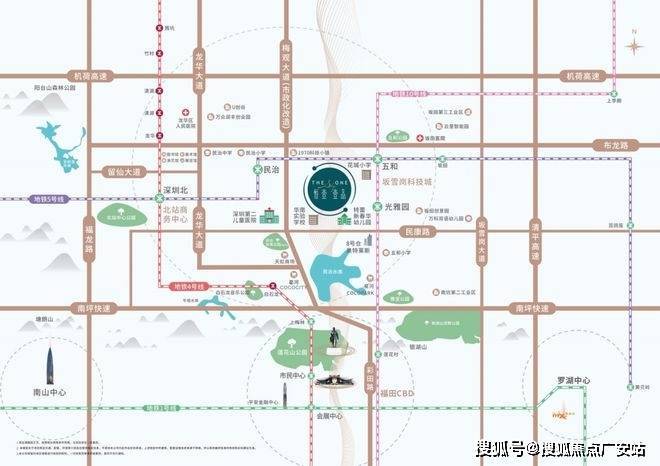 【区位—深圳中轴之芯】项目位于深圳中轴北段,地处深圳北站商务中心、坂雪岗科技城、福田CBD三大中心交汇处,教育、文化、生态、商业、娱乐休闲等多元价值荟萃,远见美好未来。