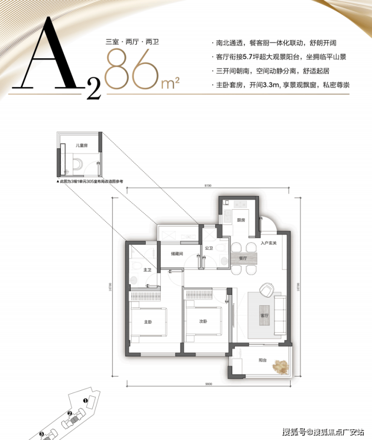 该户型定位90后三口之家,整个空间以简洁静谧作为主基调。