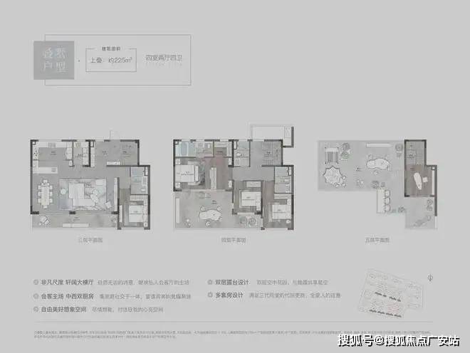这款户型设计的是4房2厅4卫的格局,每一层都透露着大宅风范。
