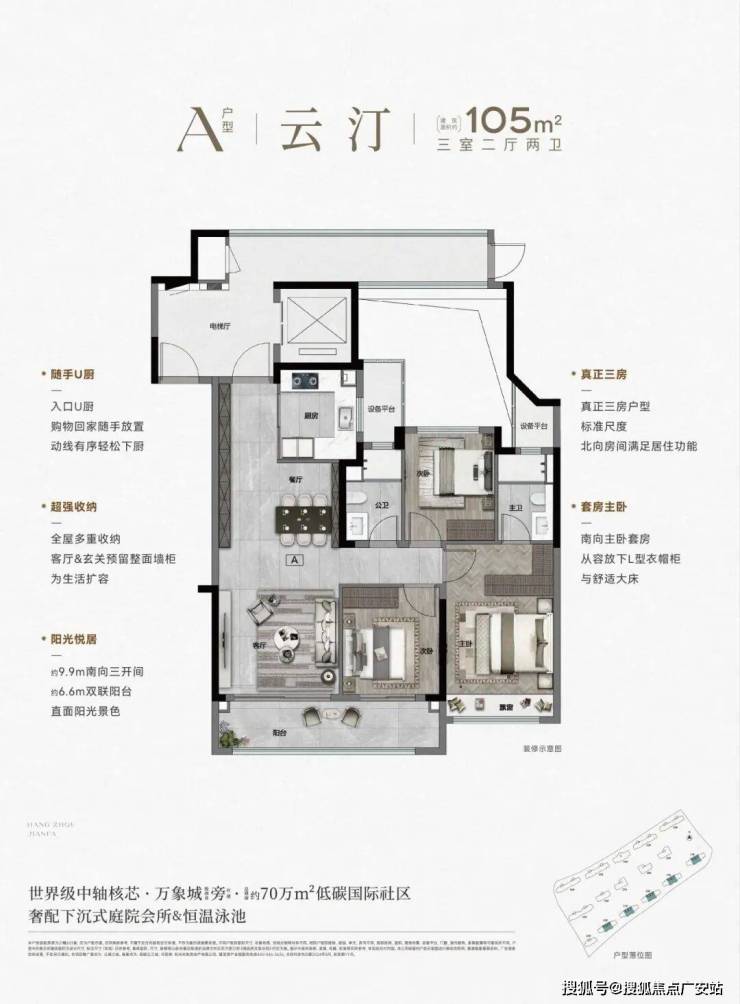 均价 / 总价:精装限价36100 元 /㎡(含 4000 元 /㎡精装);577 万起(105㎡),主力 105-239㎡,终极改善 199-239㎡