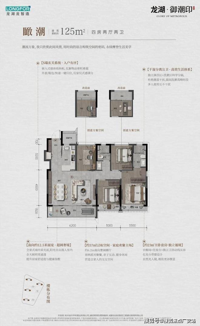 龙湖御潮印占地约2.5万方,打造纯粹的7幢高层,错落排布出约494户住宅社区。