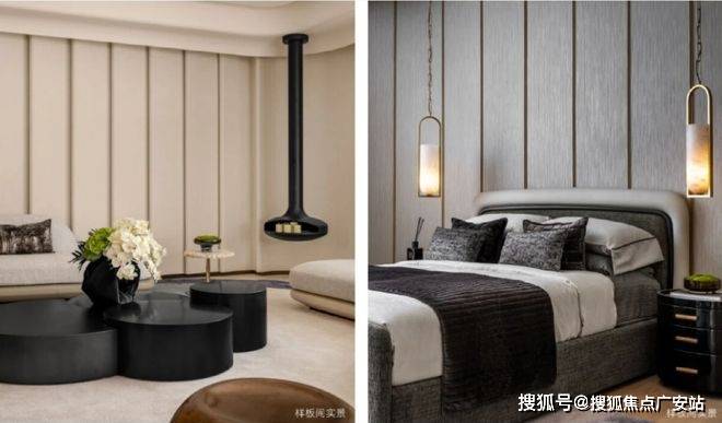南向主卧套房约30㎡,设有步入式衣帽间及独立卫浴。主卧特色背景墙由两种墙布搭配布置,上方背景墙通过波浪造型使得空间更加丰富。