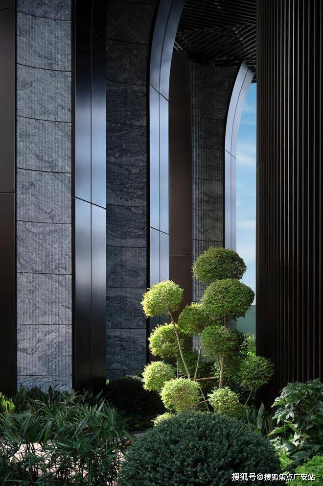 项目外立面呈现蝴蝶状的优雅造型,流动的立面与波光粼粼相互呼应,曲线模仿“飘带”线条,进口浅色花岗岩,结合金属铝板包边,形成“金镶玉"的高级质感,贵气十足又不失灵动曲线之美。