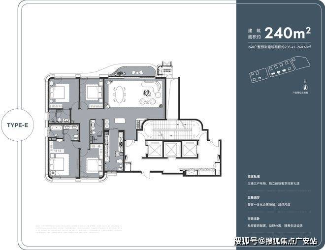 约240㎡4房产品,是典型的大面宽设计,临江面宽高达16米+,超大面宽客厅结合弧形阳台,搭配着270°大面积宽幅全高玻璃窗,将整个滨江景观尽收眼底!