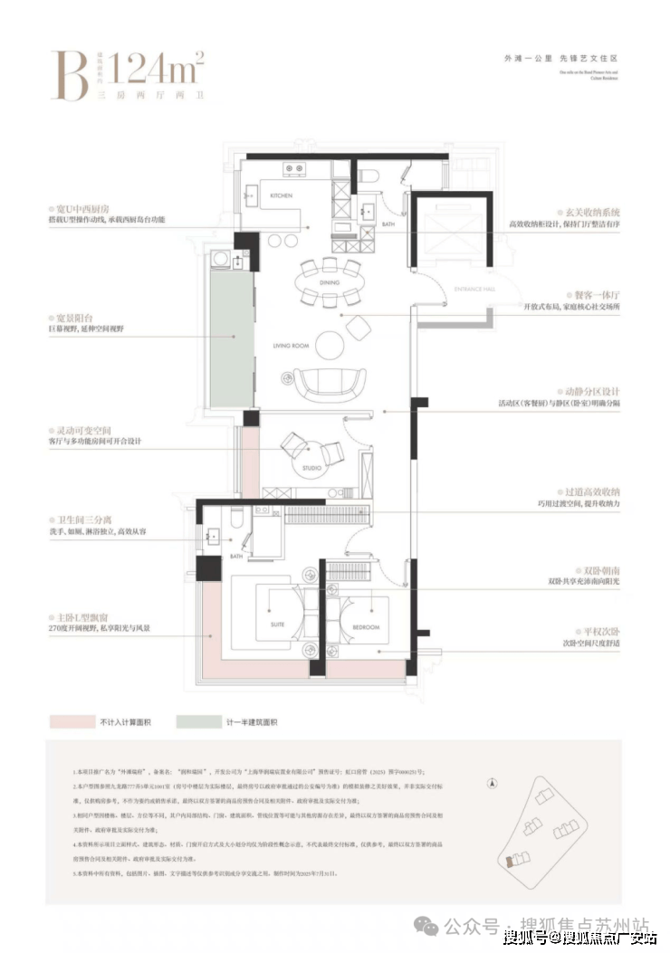 建面约124㎡的边厅“全景舱”户型,是外滩板块极致稀缺的臻品。它以三房布局满足主流家庭需求,更以无遮挡的视野与巨幕般的边厅落地窗,将城市天际线化为私藏画卷。主卧270°L型飘窗,让阳光与风景成为生活的主角。