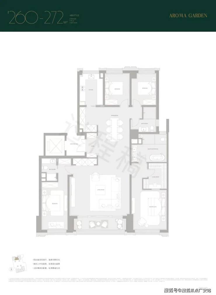 建面约260/272㎡,南向双套房,尤其主卧是豪华套房,带独立衣帽间,卫浴间含双台盆+淋浴+浴缸+马桶四件套。