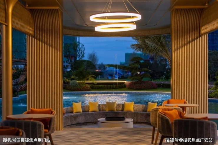 整个户外会客厅处于景观中轴之上,从池边向中央“生长”,靠近中央的位置还特地做了一个下沉空间,在蔚蓝的水池间涌动出度假的松弛感。