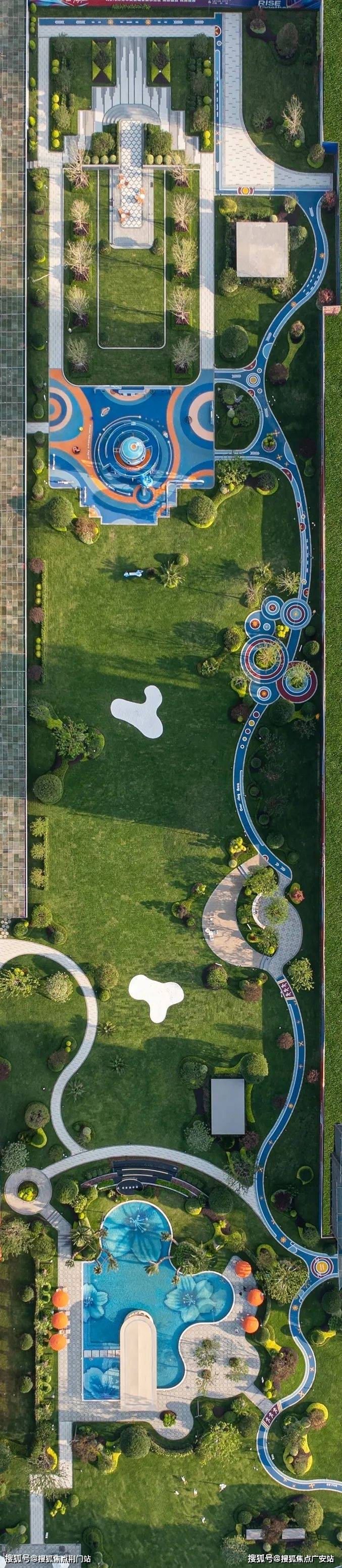 绕着社区走一圈,还会发现一条长约2.4千米的彩色跑道像丝带般把各个景致串了起来。在蓝色区域散步或橙色区域运动时,路边还有樱花、桂花等四季植物相伴,一般的有氧运动根本不需要再去健身房抢机器了。