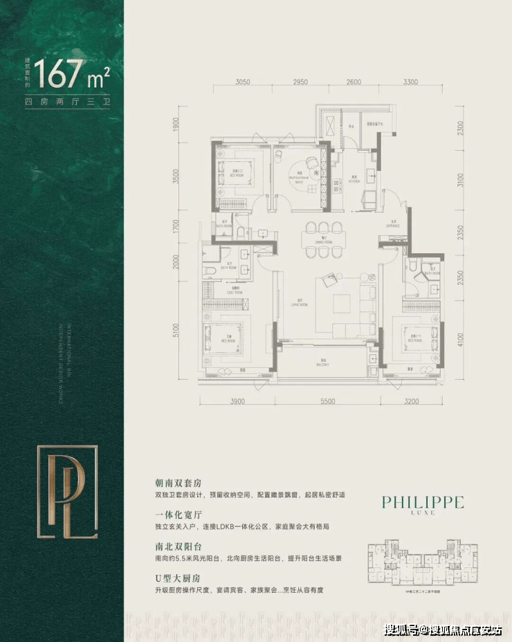 而建面约167㎡则是四房三卫格局,双套房设计,约40㎡的剧院式横厅,客餐一体,气场全开。市北、滨江的不少改善家庭,都在等它上线。