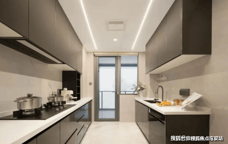 16项厨卫系统中,标配方太全隐升降款油烟机、三眼灶、15件套洗碗机。顶上有奥普凉霸,灶台有岩板背景墙,不只实用,还细致关照厨房的“清洁动线”。
