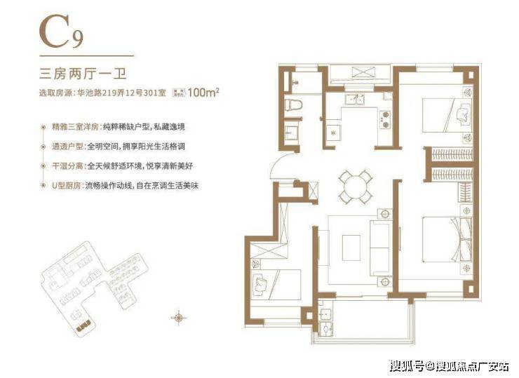 U型厨房的设计、干湿分离的卫浴、套房式的主卧等等。