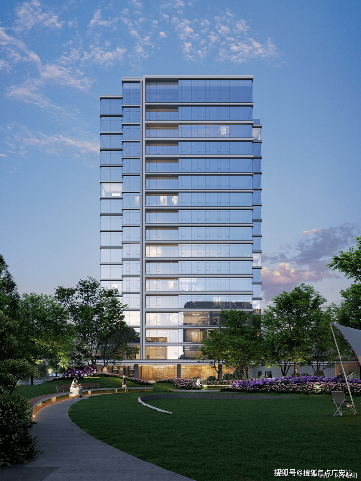 整个园区以围合式布局展开,七幢建筑借鉴中国古典园林的精髓,最大楼间距达到了63米,使得每栋楼都能享受到270°的开阔视野,仿佛是一座座隐匿于花园中的岛屿。为了与景观相呼应,园区立面采用“水晶天幕”设计,线条纤细,使建筑宛如天空中垂下的纯净湖面。