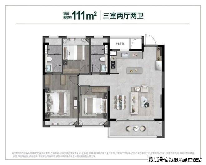 功能性和生活质感.目前高层大横厅约111㎡户型三房两厅两卫,