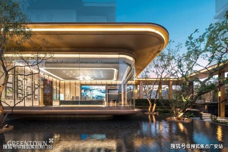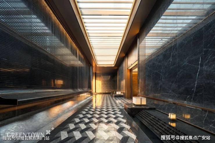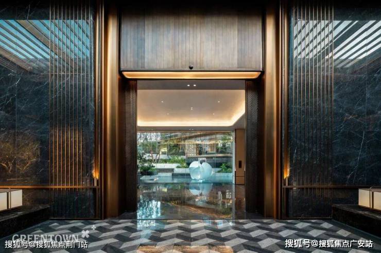 主入口知·云栖,取意西湖十景以"洄游"为理念,超52米跨度的回字形布局,重构传统"四水归堂"空间序列,约2.4米“流光礼宾”塔冠,如悬浮的美学灯塔,与金色挑檐相映成辉,全封闭式阳台勾勒建筑轮廓,让立面如镜幕般收纳约30公里江岸鎏光!