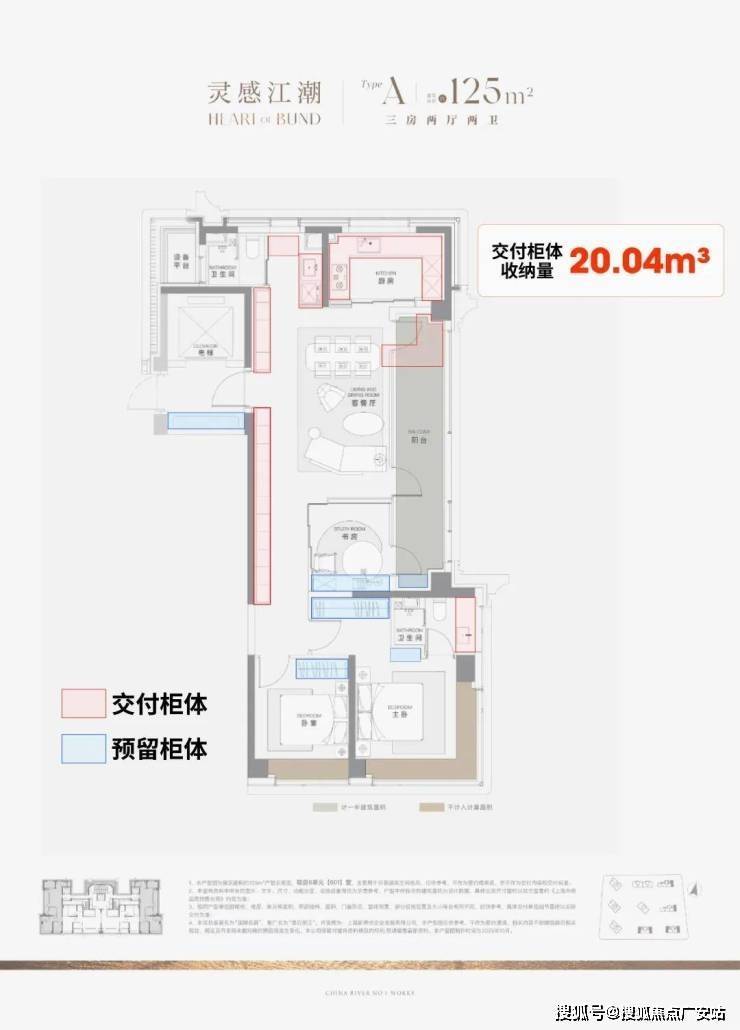 据小胖君手工统计,项目125㎡3房边套户型的整体交付柜子+预留衣柜,收纳空间可以达到约20.04m³,中间套户型也能达到约16.56m³!