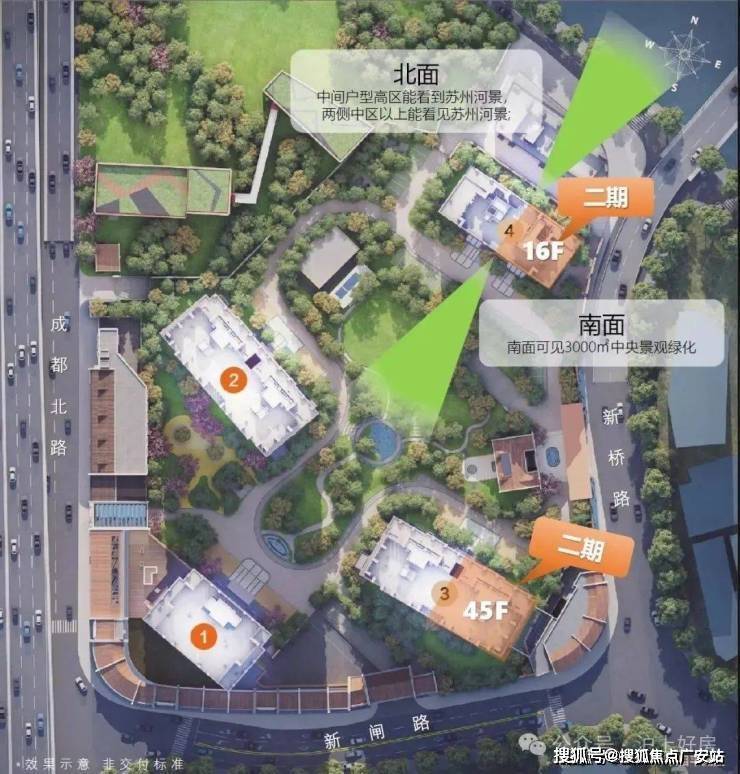 其中2#为超高层,北向可观小区绿化和苏河景观,高区可瞰三件套盛景。