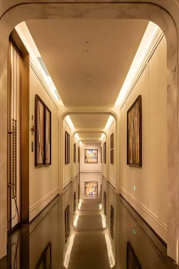 项目入口门厅汲取外滩建筑与百年酒店的典雅肌理,以圆拱形门廊为核心设计语言,象征和谐、团圆与文化的融合。圆拱造型不仅是海派文化的经典符号,更与现代艺术细节交织,通过精致的石材与金属线条,营造出庄重而不失优雅的归家仪式感。步入门厅,超大的玻璃框景将社区园林引入室内,自然光影与空间交相辉映,让每一次归家都成为穿越喧嚣、步入宁静的仪式。