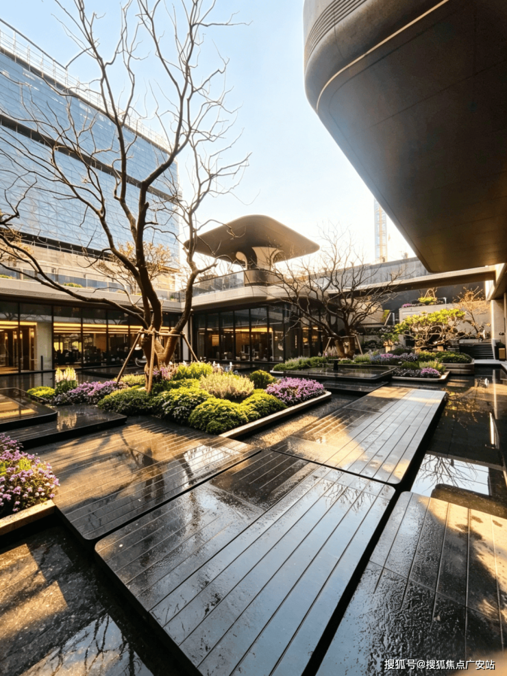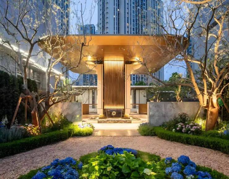 展示区以下沉庭院为核心,打造了一个“水景+光影”的立体景观体系。庭院以水为主题,中间贯穿几颗精致卵石,天光云影倒映水中,仿佛一幅流动的画卷。通过五重时空序列设计,空间层层递进,从门厅到廊架、从地面到地下,每一处转折都充满惊喜。光影景观廊架以序列感设计引导归家动线,而生活中心电梯厅则复刻华尔道夫百年经典时钟造型,电梯开合间仿佛与历史对话,定制地毯与铜杆工艺更彰显隐奢质感。