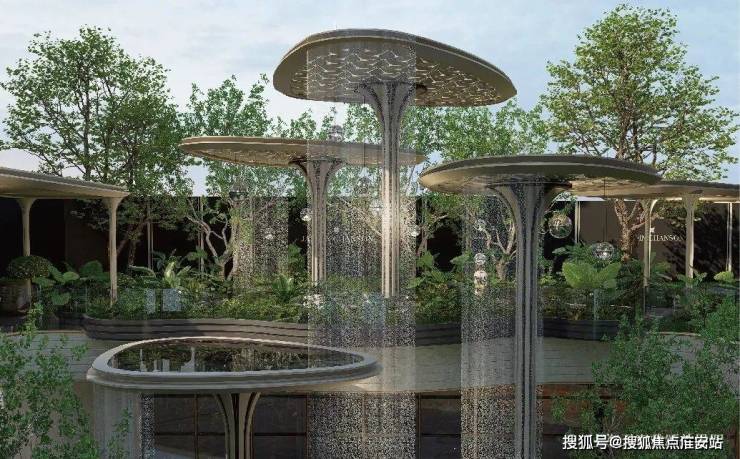 树与树编织而成一座座漂浮空中的立体浮亭,述说着自然生长的力量。艺术气泡装置蔓延而上浮于空中,在浮亭间荧光闪烁,伴随逐点星光,叠瀑从最高处潺潺流下。 艺术化重绎植物、构筑、流水的关系,三位一体拥光抱影,宛若“水木鎏金”般的空中华庭。