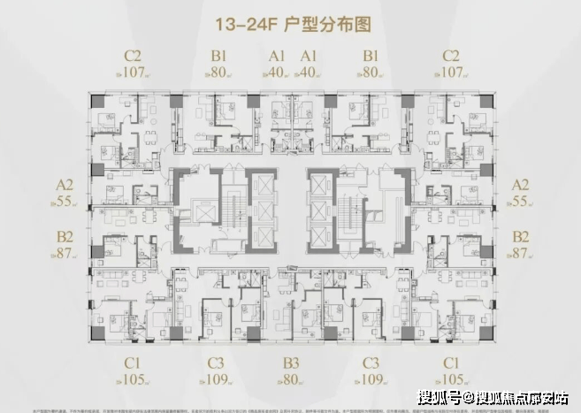 低区13-24层,户型分别是 40㎡,55㎡,80㎡,107㎡;