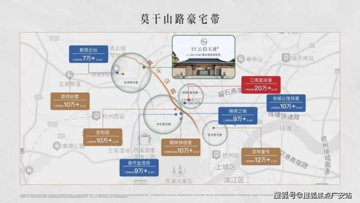 首先是位置,云启玉渚位于杭州最主要的莫干山路豪宅带,所谓「一条莫干山路,半部杭州豪宅史」,串联起了良渚-申花-桥西-武林四大豪宅圈,囊括了江南里、宜和园、武林壹号等杭州顶级豪宅。