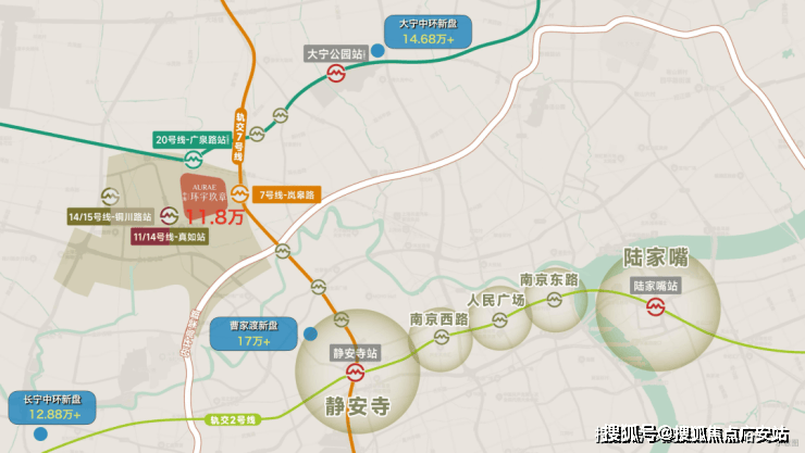 对比同为7号线沿线的静安曹家渡新盘17万+/㎡的价格,3站地铁就相差5万+/㎡的单价。