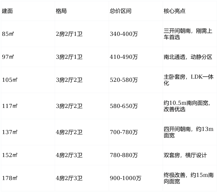 全周期户型:85-178㎡覆盖刚需到改善,总价友好,适配各类家庭。