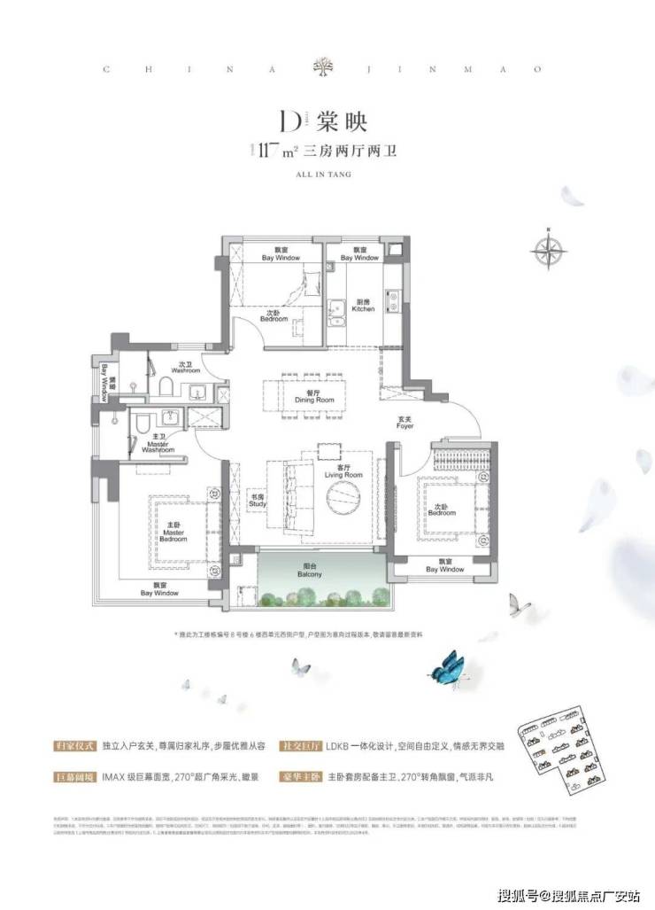 建面约117㎡3房2厅2卫,做到了3+1开间朝南+5个飘窗+主卧套房设计+270°转角飘窗,所有的尺度都有进一步提升。