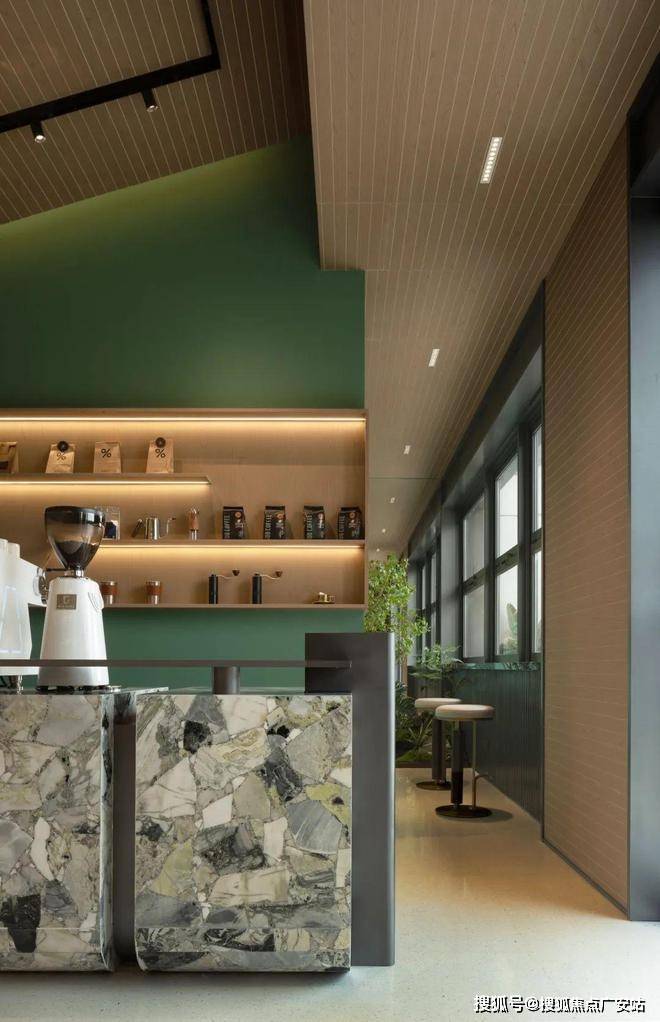 金色飘檐擦亮辨识度,南立面以大面玻璃主打,白、金、蓝灰为主调,配合部分涂料;基部用上了贝金米黄大理石,温润如月光。