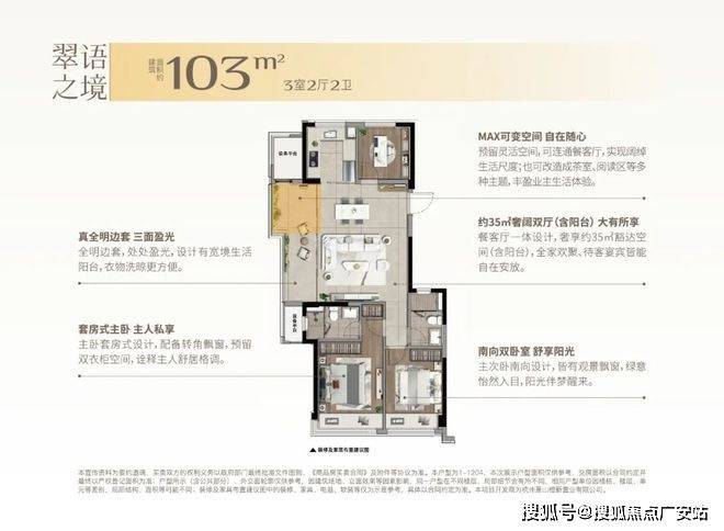 建面约103㎡的边套更是堪称神迹,将小户型的空间魔法玩到了极致。客厅到阳台的地面、天花直接拉通,甚至两侧的墙垛都已隐身,整个餐客厅面积达到约35㎡(含阳台),这可是140㎡以上大宅才有的空间感!