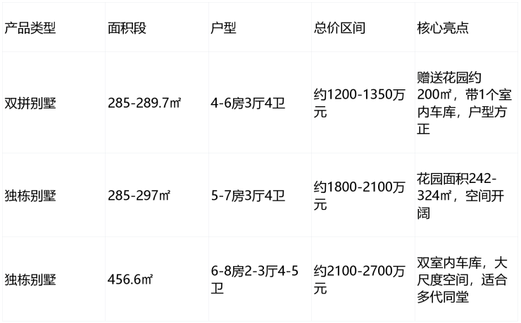 双拼(285-290㎡)与独栋(285-457㎡)为主,均为4-8房大户型,满足三代同堂需求