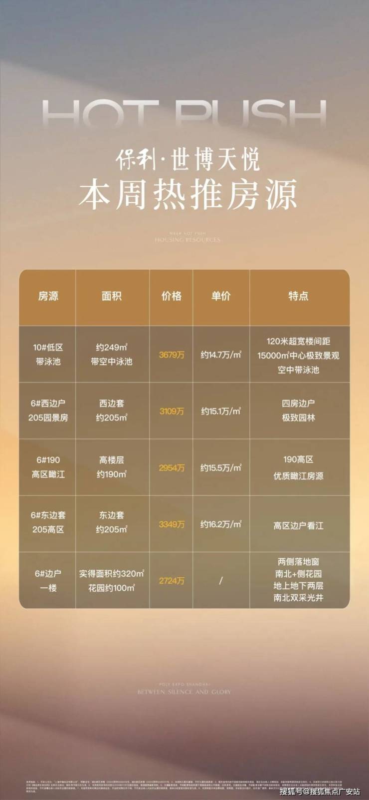 「保利·世博天悦」二期将推5#、10#楼,共172套房源,主力建面约190-205-240-251㎡,均价16.8万/㎡。