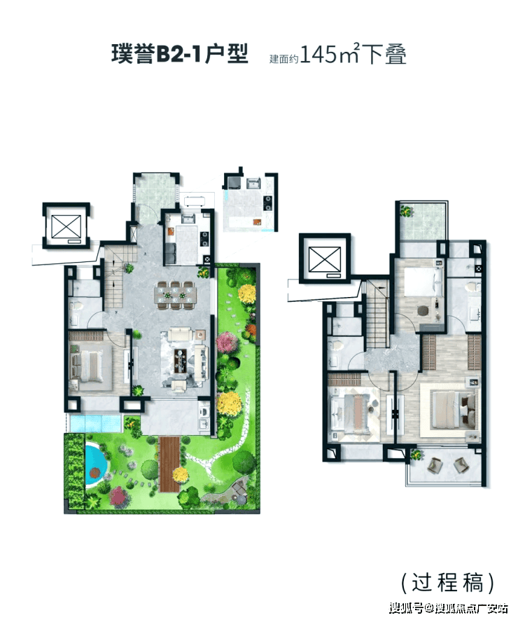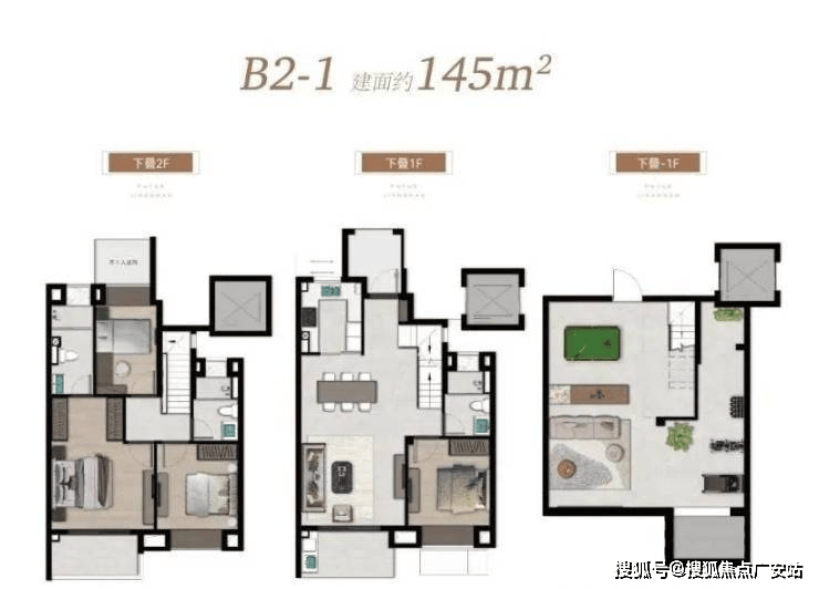 叠墅:建面约123-145㎡,主打空间感,下叠带庭院,上叠有露台。