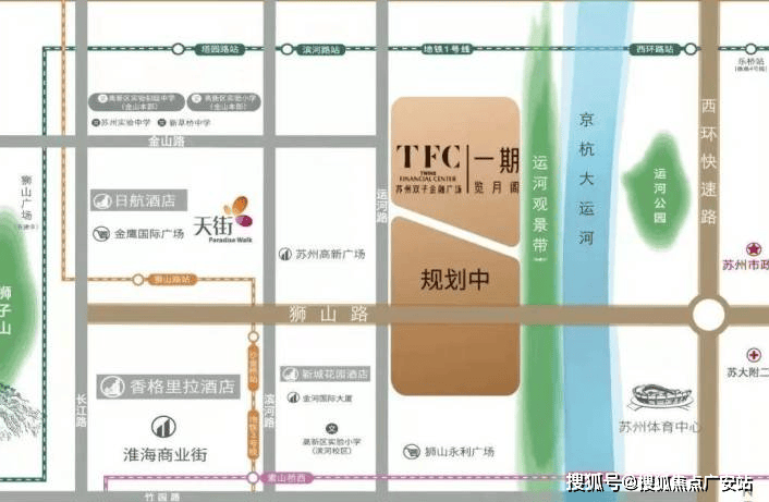 本项目在狮山 桥下,京杭大运河旁,占据了新区狮山板块的核心地段,坐享新区繁华商圈,紧邻姑苏古城风韵,集人文精神和高品质生活为一体,将打造为狮山板块乃至苏州市具有代表性的地标建筑。