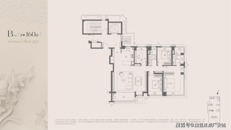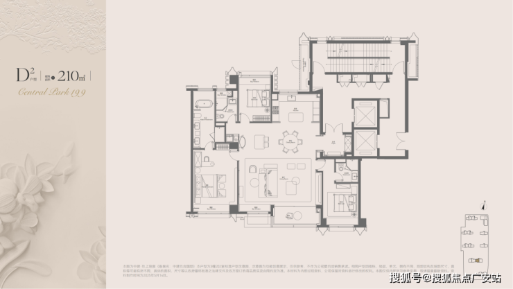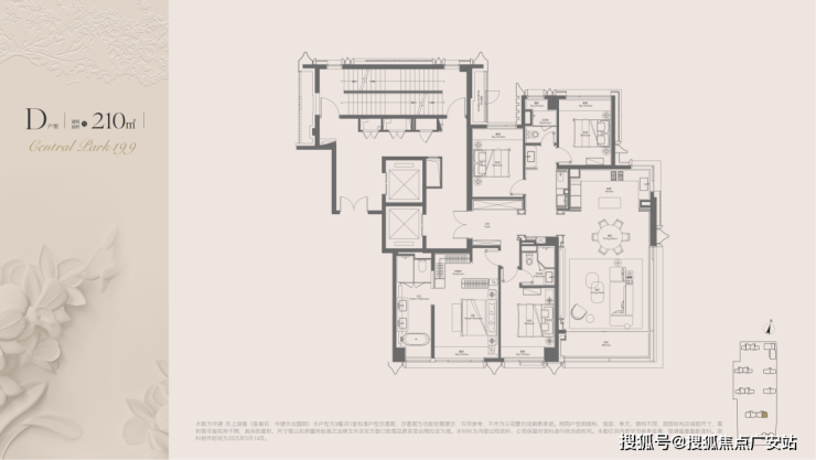 同样为两梯两户+独立电梯厅+双套房格局。边厅设计带来东、南双向约270°采光,俯瞰中央下沉庭院与大宁公园,视野极佳。