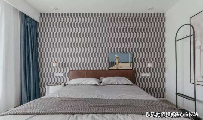 主卧木色的地板,波普纹理的背景墙,挂衣架及装饰画的搭配,灰白色的床品,整个空间色彩搭配温柔之余,尽显简洁雅致的调性。