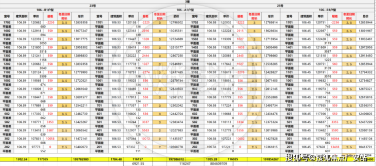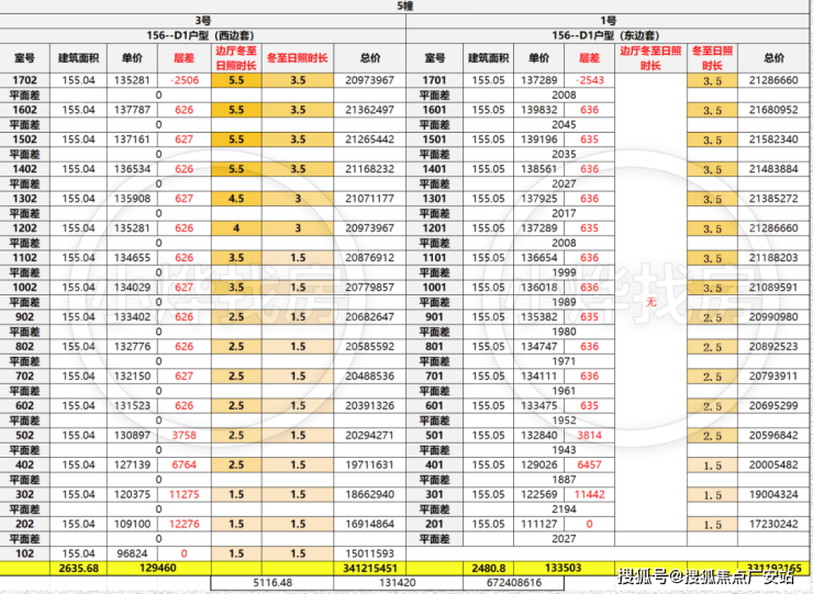 水平差方面,边套是156的大户型,同一楼层中,东边套比西边套贵2000元/㎡左右,中间套都是A2户型,同一楼层中,3单元01室最便宜,2单元比3单元贵835元/㎡左右。1单元02室比3单元01室贵500元/㎡左右。