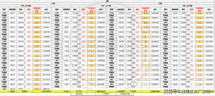 水平差方面,因为西侧靠近目前的加油站,前面还有车库的出入口,所以西边套的价格最便宜。东边套比西边套贵11000-12000元/㎡左右。中间套A1户型,同一楼层中,22号的02室相比21号的01室要贵2000元/㎡。价差是比较大的。总的来说就是越往东侧越贵。