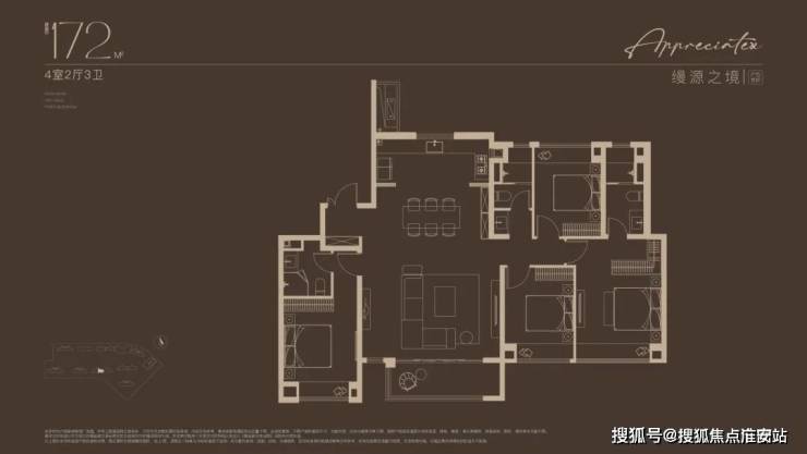 建面约172㎡4房户型,多娃家庭的进阶之选!奢阔尺度尽显家族气度!2梯2户, 子母双开门礼序入户,私密尊崇门厅;约16米四开间朝南,搭配约6米尺度横厅,揽四时风景入怀。
