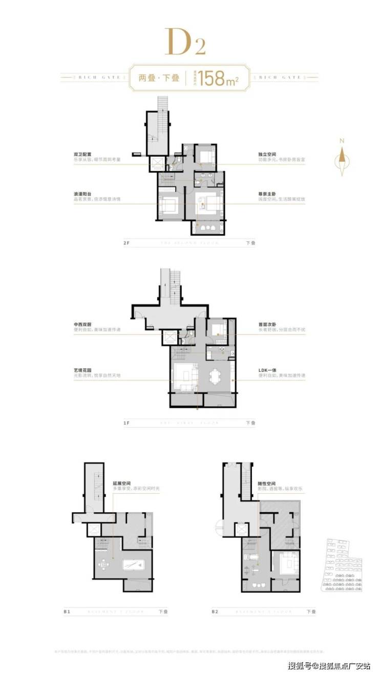 约158㎡下叠:南向大花园+北入户花园+双层地下,2F空间开阔,书房可作次卧