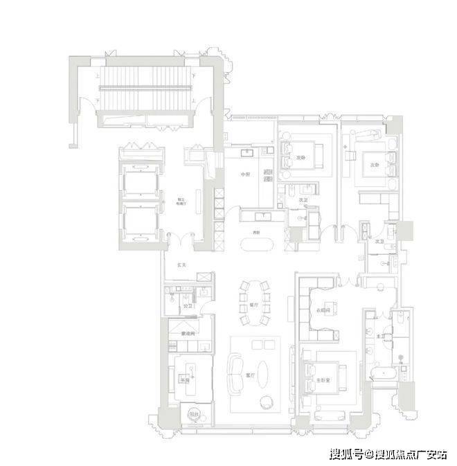 约600㎡户型是6房带4套房,完整满足了居住在平层的所有功能空间需求。