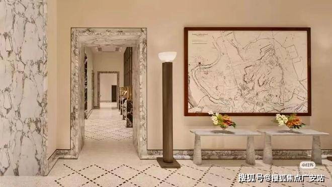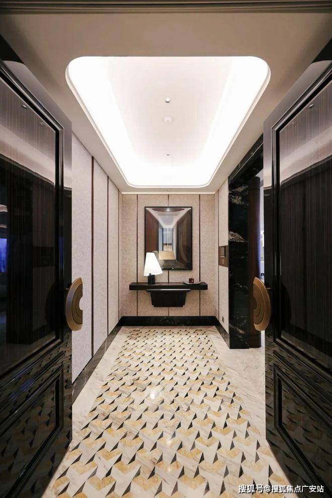 另一个样板房是约320平方米的中间套,采用两梯两户设计,独立门厅。