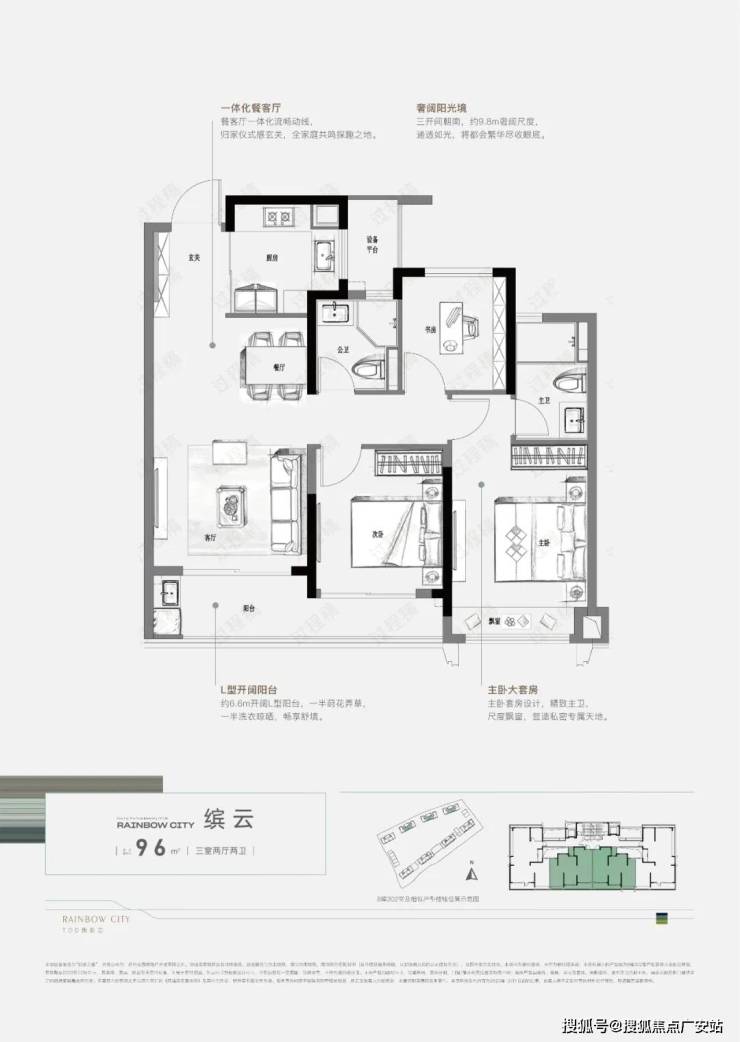 96㎡三房两卫: 6.6米L型双联阳台:一半养花喝茶,一半洗衣晾晒,阳光从早晒到晚;