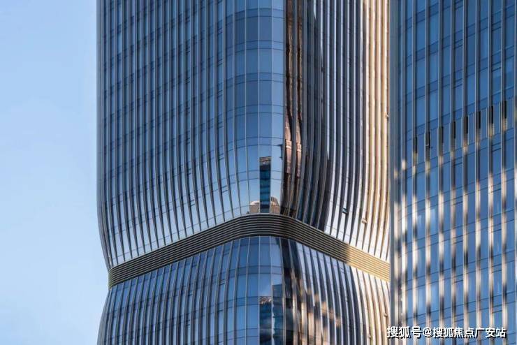 独特的古铜色建筑立面在建筑群中脱颖而出,铝板与玻璃的双材质交叠,使得立面在不同的光线角度下产生丰富的视觉变化,极似莲池“水韵”。通过抽象凝练水波纹路,将自然融入建筑,塑造出典雅现代的办公及商业形象。