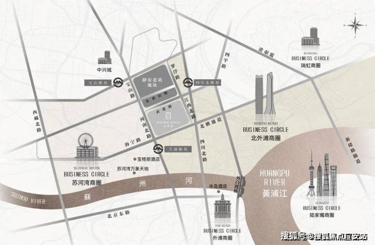 仅从图上看,该地块直线距苏州河约1公里,直线距外滩约1.4公里,直线距北外滩约1.7公里,直线距3/4号线宝山路站约300米,直线距10号线四川北路站约560米,区位优势明显.