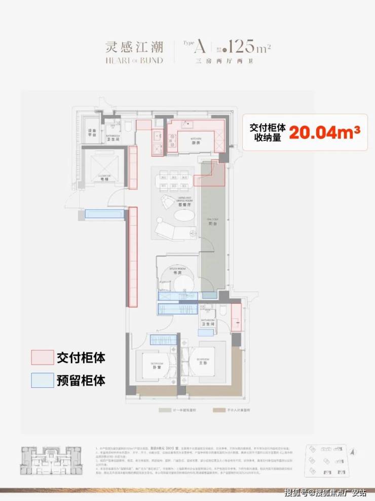 据沪上好房统计,项目125㎡3房边套户型的整体交付柜子+预留衣柜,收纳空间可以达到约20.04m³!中间套户型也能达到约16.56m³!