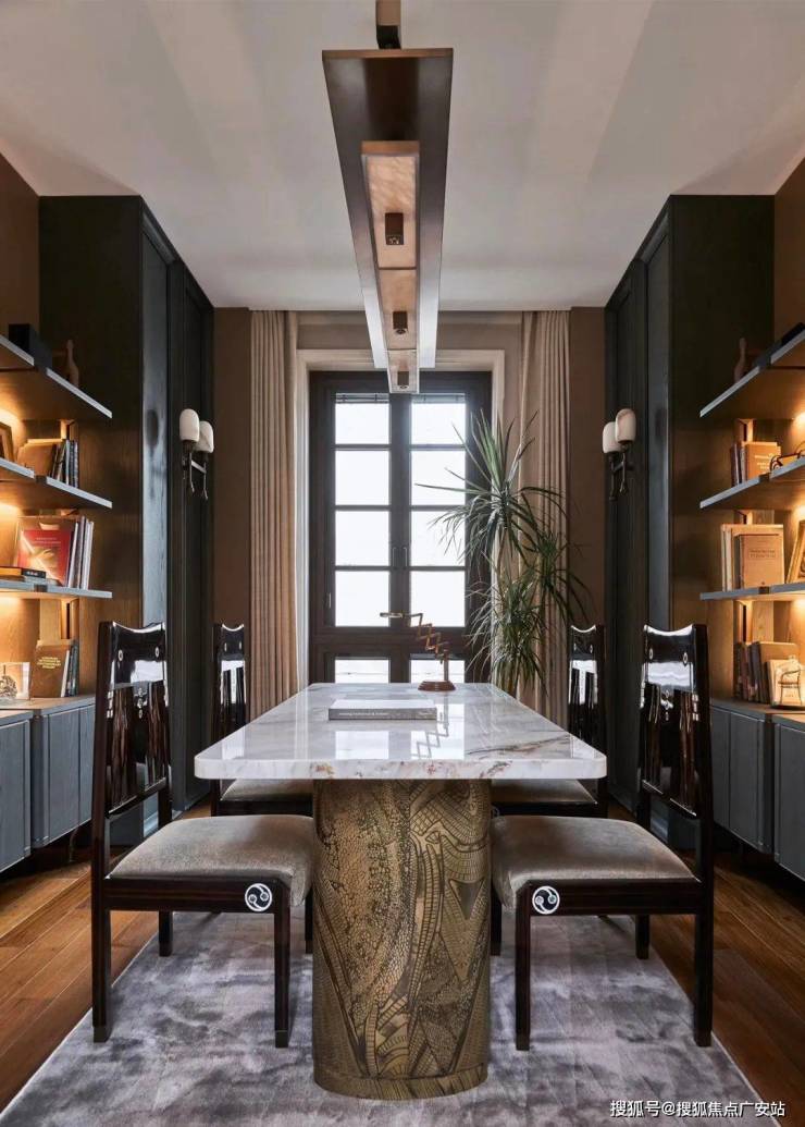建筑面积约495㎡传家大宅,海派气质内外辉映;深色木饰面与柔和的刺绣主背景,框定空间层次格局,营造稳当厚重的氛围基调,法式留白的墙面与顶部造型,与原筑提取的典型拼花地砖相呼应,经典的精致与典雅,海派传家大宅的气度不言而明。